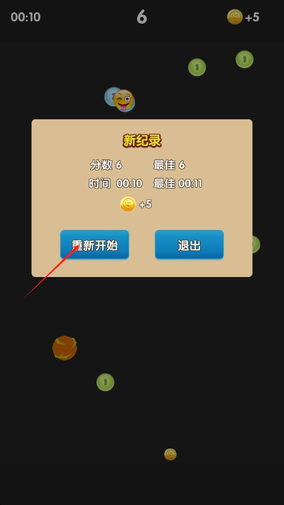 3、游戏结束后查看成绩,若想继续挑战,点击重新开始按钮,开启新一轮游戏。