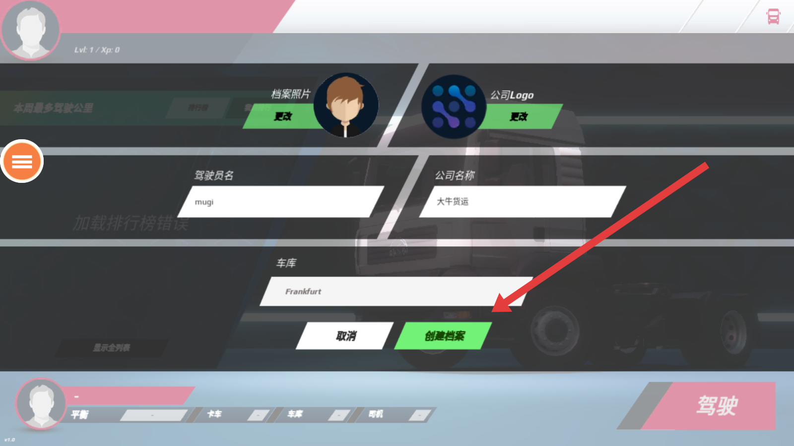 1、打开游戏后,直接点击右下角的试驾,首先要创建“个人”和“公司”的档案。