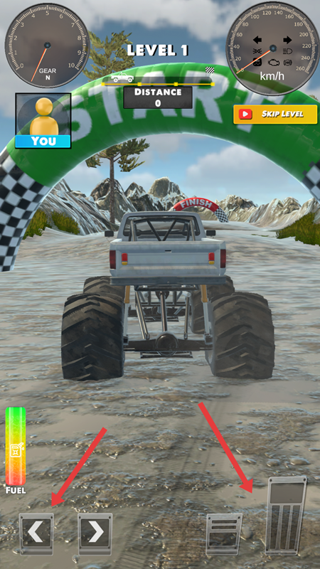 3、比赛开始,左手控制方向,右手长按长踏板启动,注意左侧油箱,注意加油。