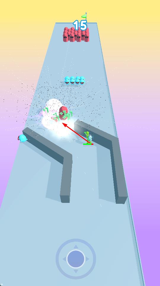 1、玩家通过虚拟摇杆操控绿色角色移动,角色自动发射光线攻击蓝色敌人。