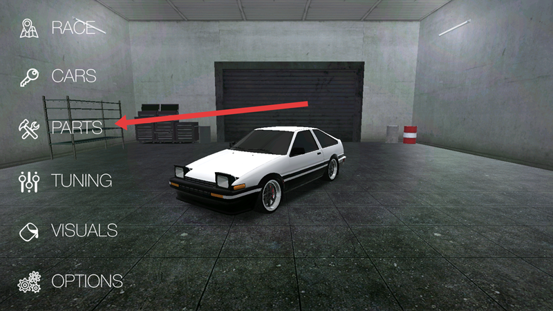 1、要快速升级必须要拥有更好性能的车子,进入游戏后选择左侧菜单的PARTS。