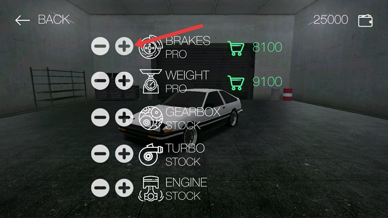 2、把对应的汽车部件全部升级到满级,点击“+”号提升,升级完成后点击BACK返回。