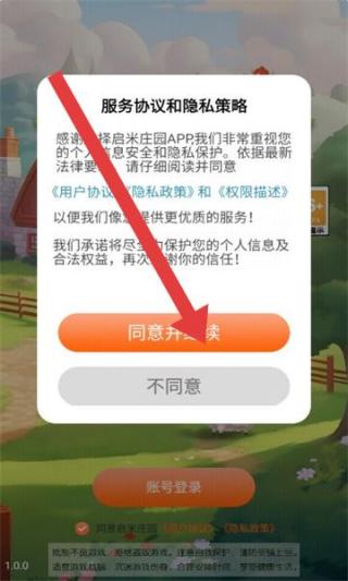1、进入游戏时,会弹出服务协议和隐私策略弹窗,点击【同意并继续】按钮,方可进入下一步操作。
