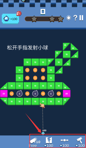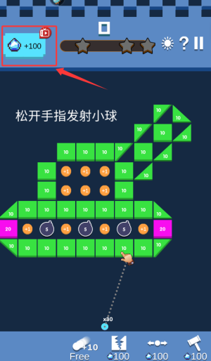 1、基础操作要领,通过手指滑动控制底部挡板移动,精准反弹小球击碎上方砖块,注意控制反弹角度与力度。