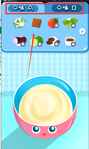 1、基础玩法自由搭配冰淇淋,选择基底口味后添加各类配料。通过拖拽完成装饰摆放。