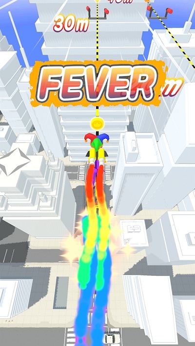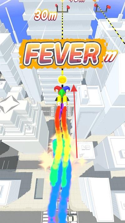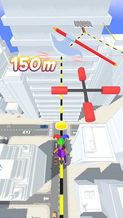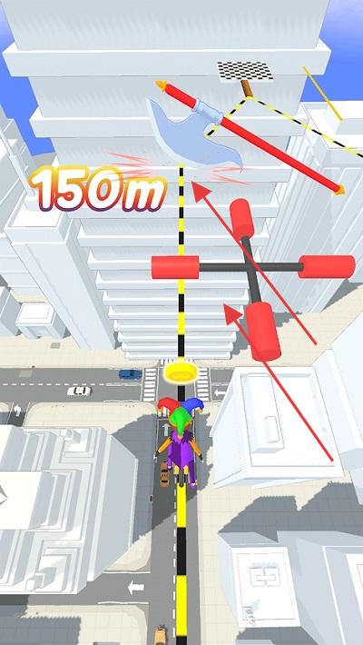 1、玩家操控穿着小丑服饰的角色,沿着垂直道路上升,躲避红色锤子、斧头、锯片等障碍。