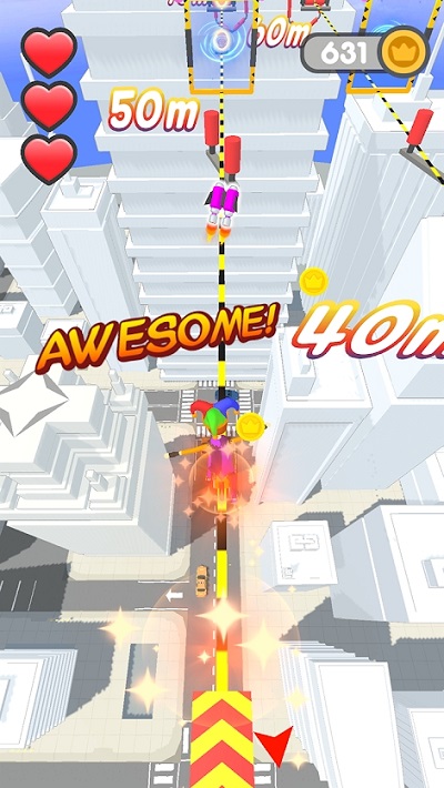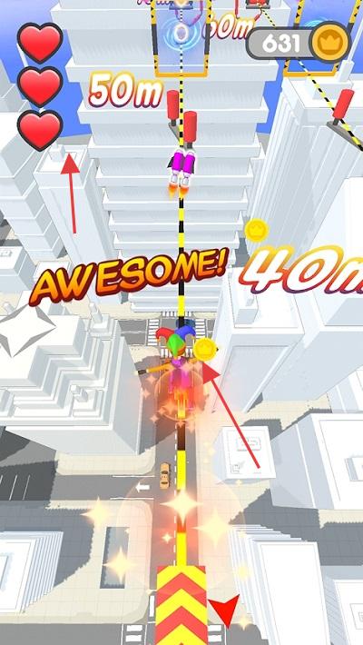 3、游戏界面显示角色生命值、距离信息,玩家需关注状态,规划上升路线,挑战更高距离。