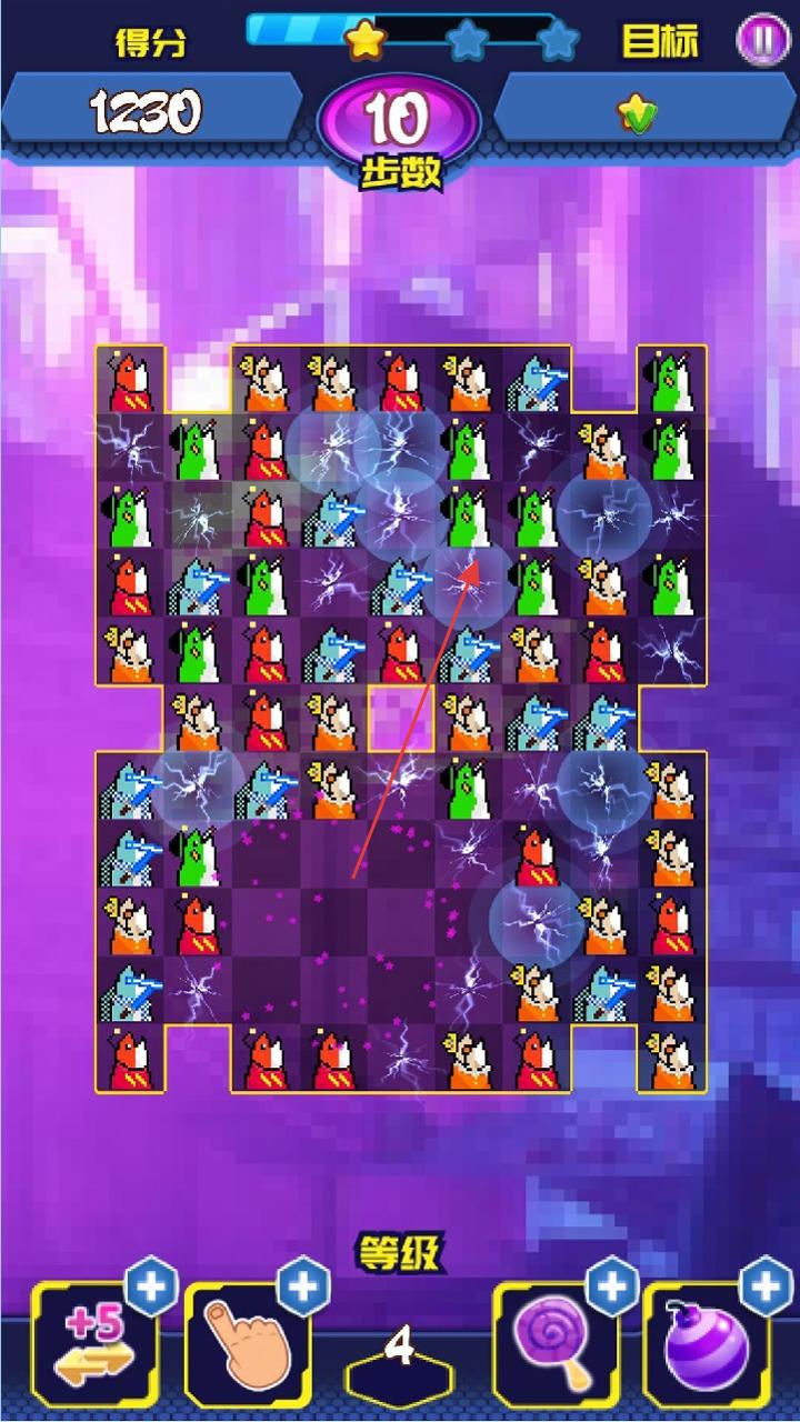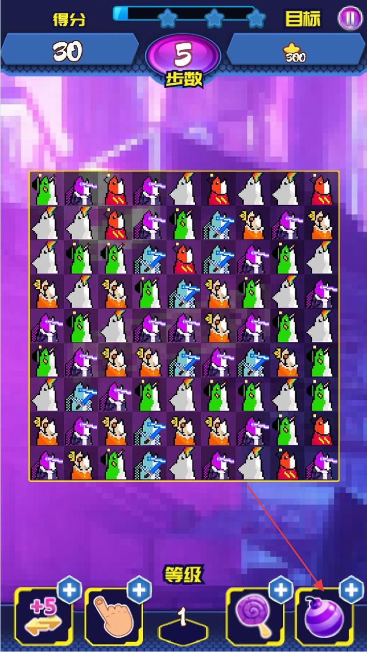 3、底部【等级】区域及“+5”“手指”“棒棒糖”“炸弹”等道具,合理运用道具能助力玩家在步数限制内更高效完成目标、冲击高分。