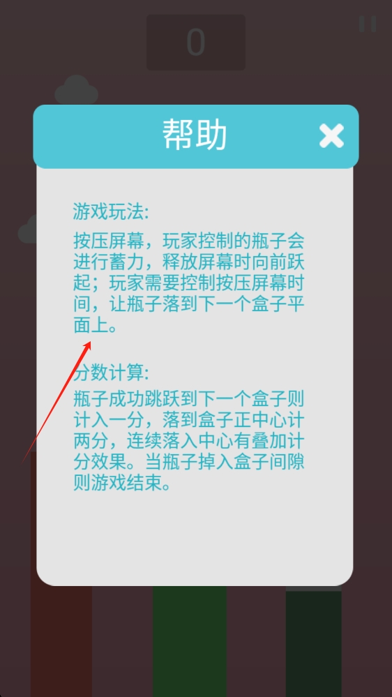 2、仔细阅读帮助说明,了解按压屏幕蓄力,释放后瓶子跃起,需落到下一个盒子平面的玩法。