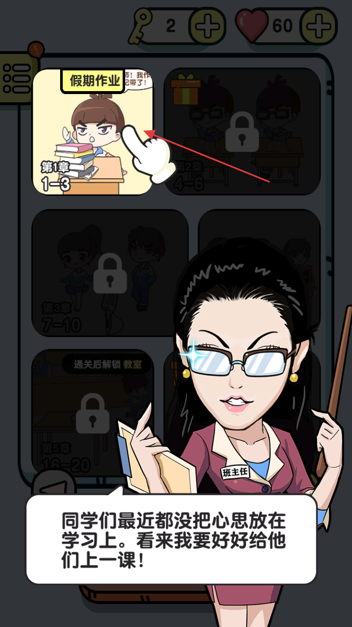 1、进入游戏界面,点击【假期作业】第1章【1-3】关卡,班主任表示要给同学们上课,开启关卡挑战。