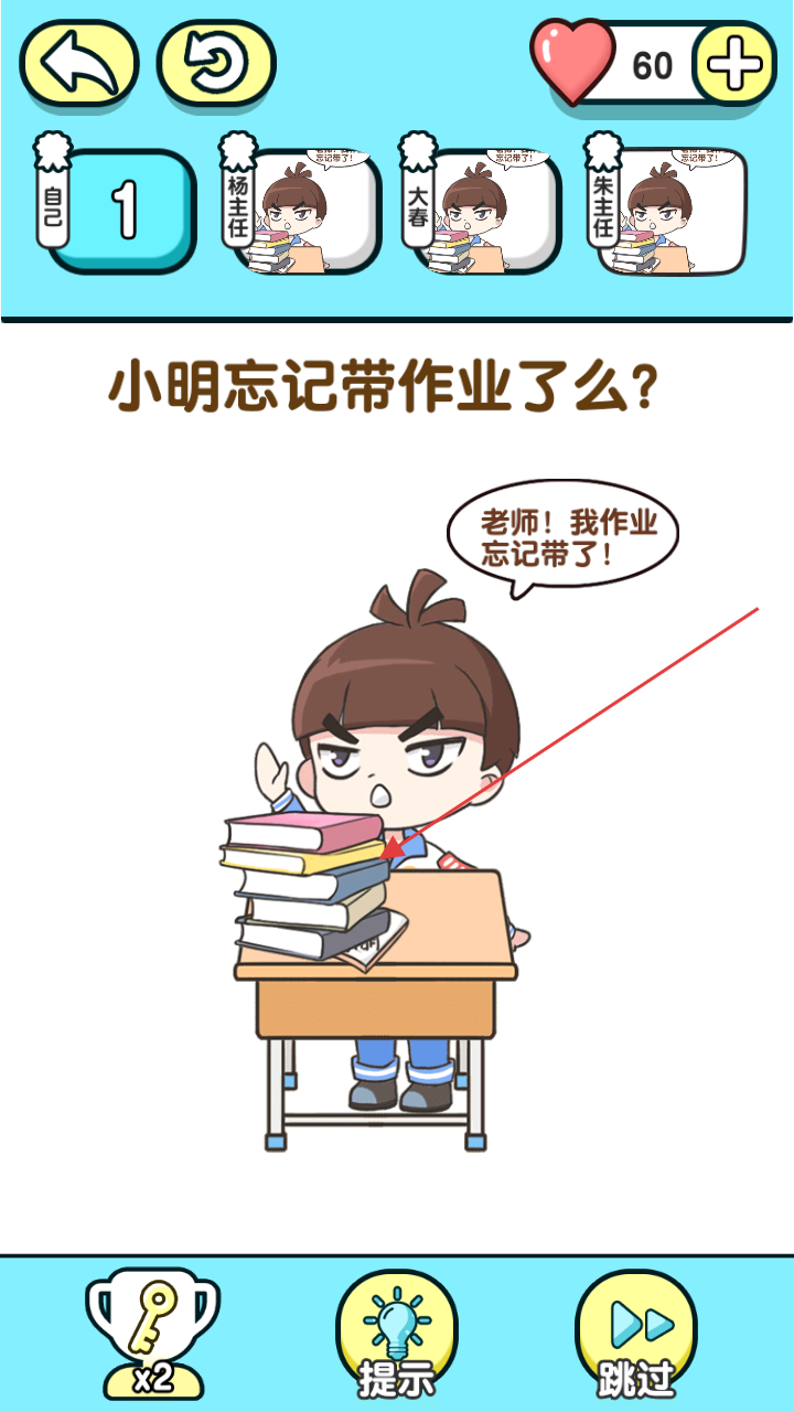 2、面对“小明忘记带作业了么?”的场景,观察图中细节,关注小明“老师!我作业忘记带了!”的表述,寻找线索。