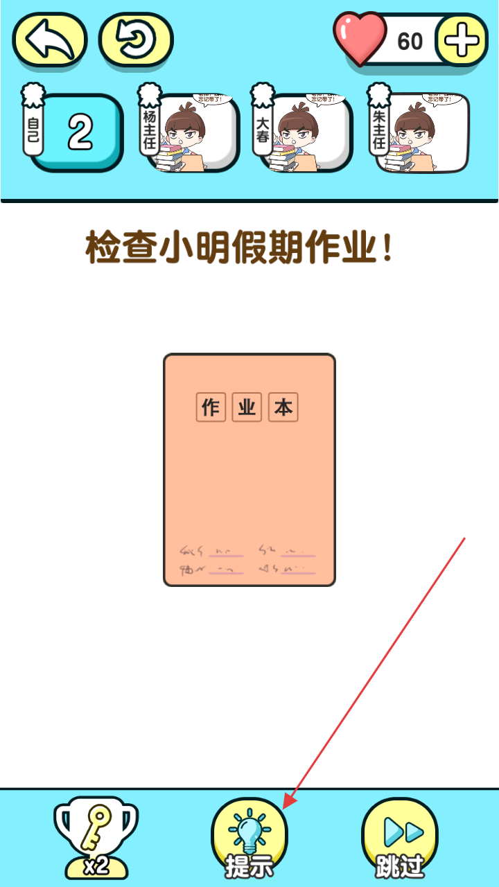 3、在“检查小明假期作业!”环节,若遇困难,点击下方【提示】按钮,获取帮助完成作业检查任务。