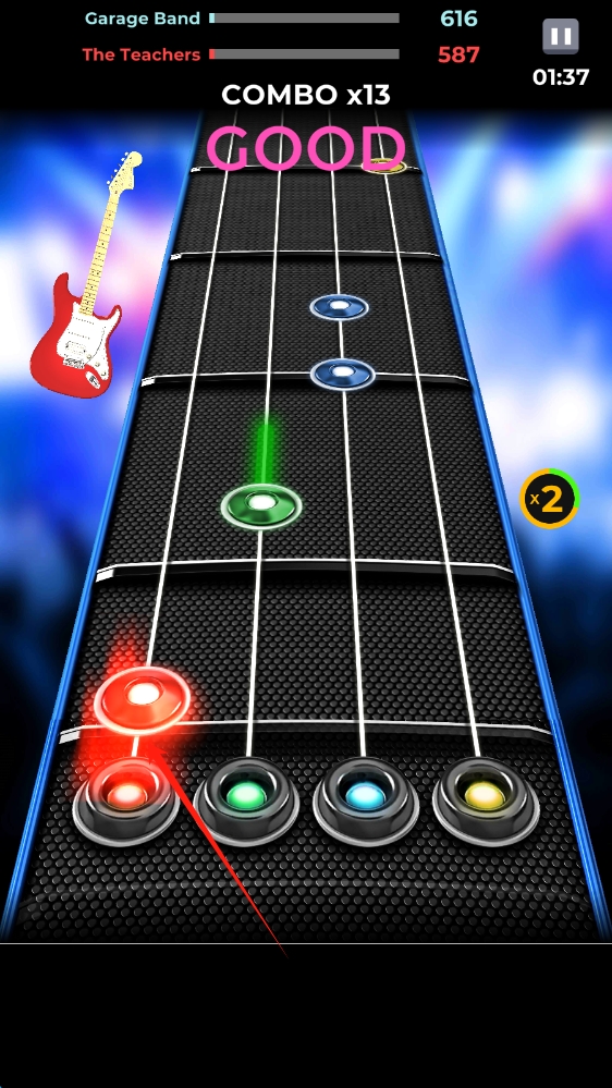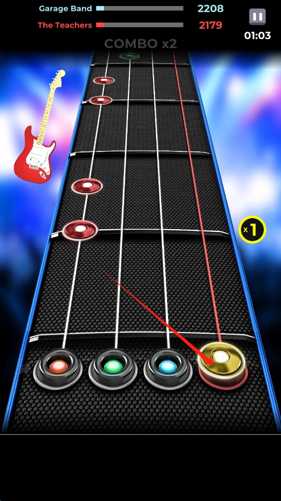 1、点击按钮消除圆圈,通过每日训练解锁高级演奏技巧,根据歌曲风格选择适配吉他,在对战中合理使用连击增益道具。