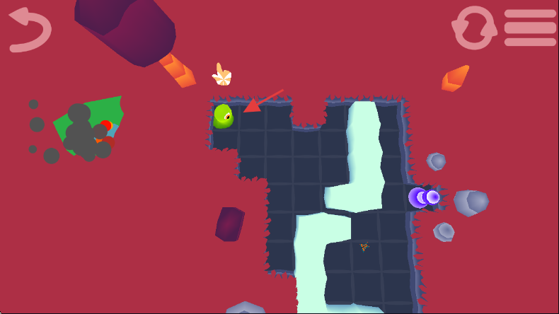 2、在迷宫场景中,操控角色(如绿色生物)按箭头方向移动,避开障碍,探索迷宫路径。