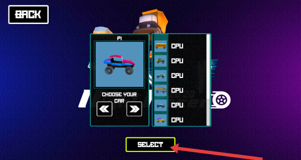 2、在选车的界面,挑选自己心仪的车辆后,点击【SELECT】按钮确认选择,准备进入赛道。
