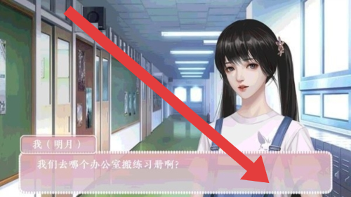 3、与角色明月(对话界面)互动,面对“我们去哪个办公室搬练习册啊?”的提问,选择箭头指向的回复选项。