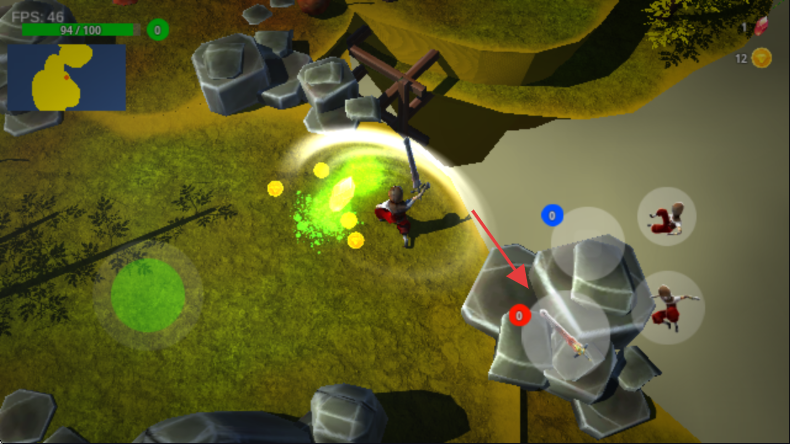 3、遇到敌人时,点击箭头指向的技能按钮,释放技能进行攻击,获取金币并推进游戏进程。