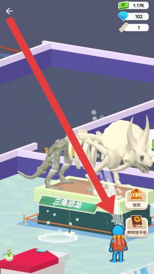1、在博物馆场景中,操控角色(蓝色小人)靠近【三角恐龙】化石展柜(箭头指向),可查看化石信息或进行相关互动。