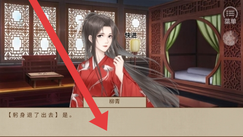 1、进入古风剧情场景,与角色柳青互动,阅读【躬身退了出去】等对话内容,按箭头推进,体验角色行为与故事开篇。