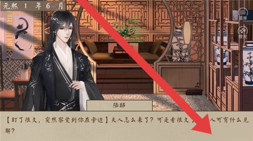 2、在与陆韶的对话中(如夫人相关情节),点击箭头区域,跟随剧情发展,解锁人物互动与场景转换,了解角色关系。