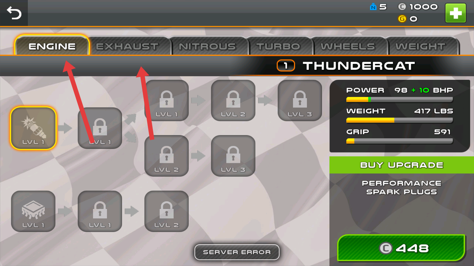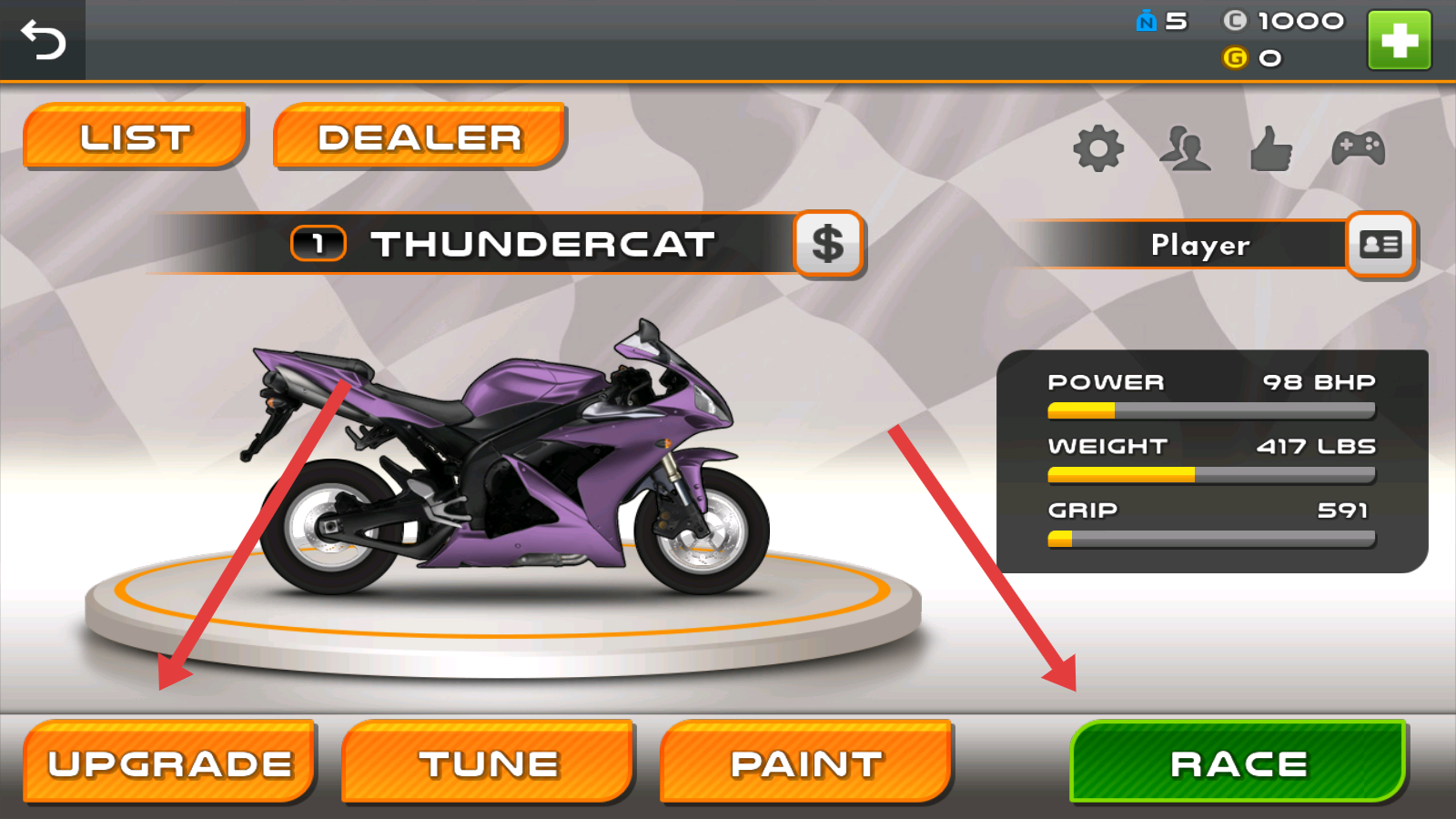 1、在游戏主界面,点击左下角的GPGRADE可对爱车进行改装,点击右下角的RACE开始游戏。