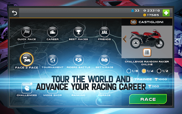 世界摩托大赛将带你进入充满激情的摩托竞速世界,从城市街道到荒野沙漠,自由驾驭几十种不同的赛车左冲右突。游戏支持细致化改装,改装系统堪称业界最强,几乎涉及了摩托车的每一个细小部件,就连火花塞都支持升级,超仿真显示场景让你完全欲罢不能。全球排行榜则等着你用技术征服。
