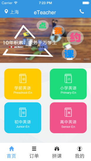 eTeacher是一款英语学习类手机软件,这里涵盖了从学前英语、小学英语再到初中英语和高中英语的全部课程,汇集了海量名师,家长或学生可以按照时间等级来选择合适的老师进行约课,老师信息详细明了,方便选择,帮助学生快速提高英语水平,喜爱的朋友赶快下载体验吧!