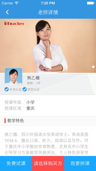 在家学英语,就上eTeacher,打造中国最专业青少年英语培训O2O平台.eTeacher是一家集不同的难度级别的学习和提高英语的练习和测试。您可以学习新词,在不同的场合,在各种情况下使用英语语法和正确使用的话。