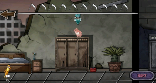 3、画面中角色可能处于追捕环节,上方镰刀的图标中有一个显示叉号,体现了玩家躲避与追捕的趣味互动,该游戏中玩家需通过变身物品来躲避追捕者。