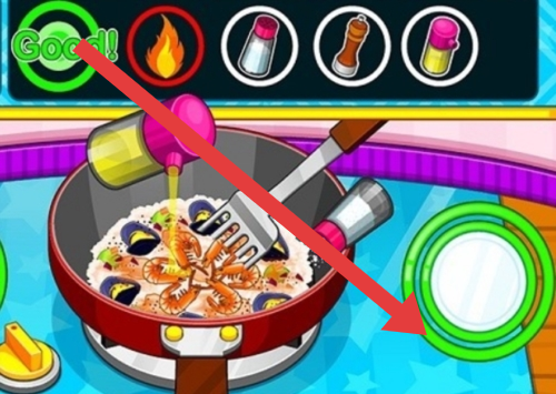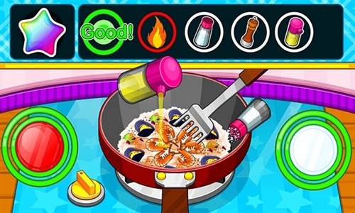 1、烹饪时,按箭头操作,添加调料(如粉色瓶子的调料)到锅中,翻炒食材(如海鲜饭),注意火候(绿色“Good!”提示)。