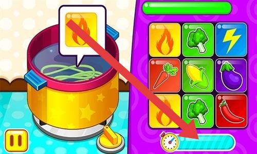 3、煮面时,根据锅上的火焰提示(黄色火焰图标),在右侧食材栏选择对应元素(如火焰图标),点击箭头指向的计时按钮。