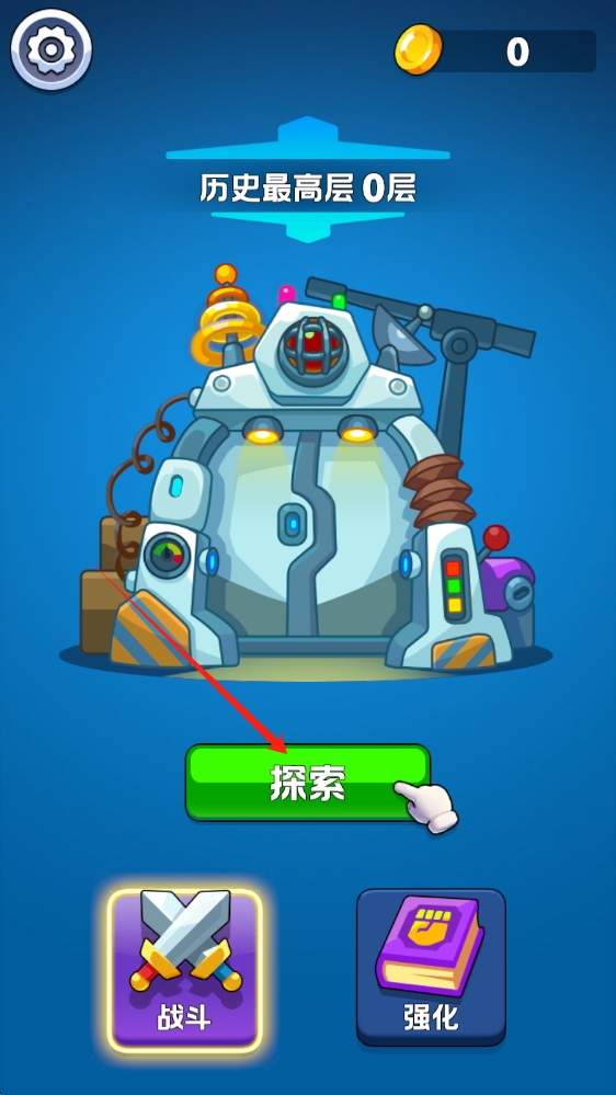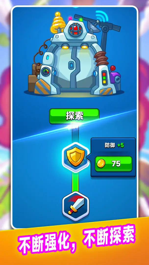 1、点击按钮探索,快速积攒机器人必杀技,面对BOSS时提前规划连击路线,集中释放高伤害技能突破护盾。