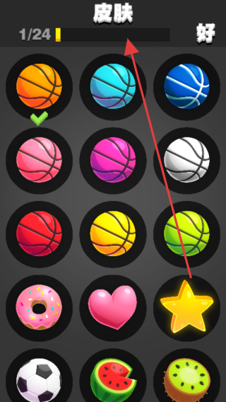 2、游戏中可在【皮肤】界面选择多样造型的篮球如彩色篮球、特殊形状道具等丰富游戏视觉体验。