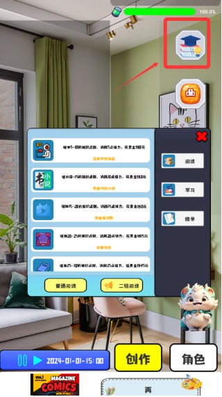 3、进入游戏,点击图示位置,可根据自己的策略想法安排学习,注意上方的电量,每次学习都会扣除对应的电量。