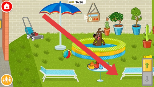 1、在庭院场景中,跟随箭头指向(如躺椅附近),点击互动物品(如水果盘),完成庭院互动任务,熟悉场景操作。