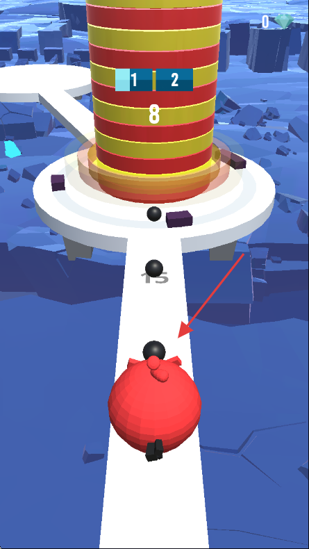 3、控制红色小鸟沿跑道前进,收集路上的球并避开方块,朝着目标塔冲刺。