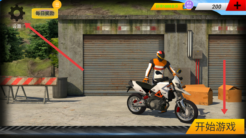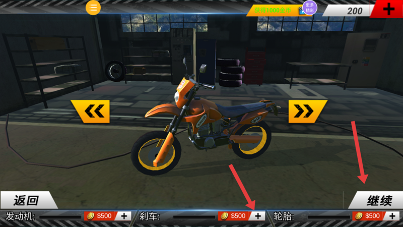 2、选择一辆摩托车,可用金币升级不同配件的属性,然后点击继续,进入驾驶。