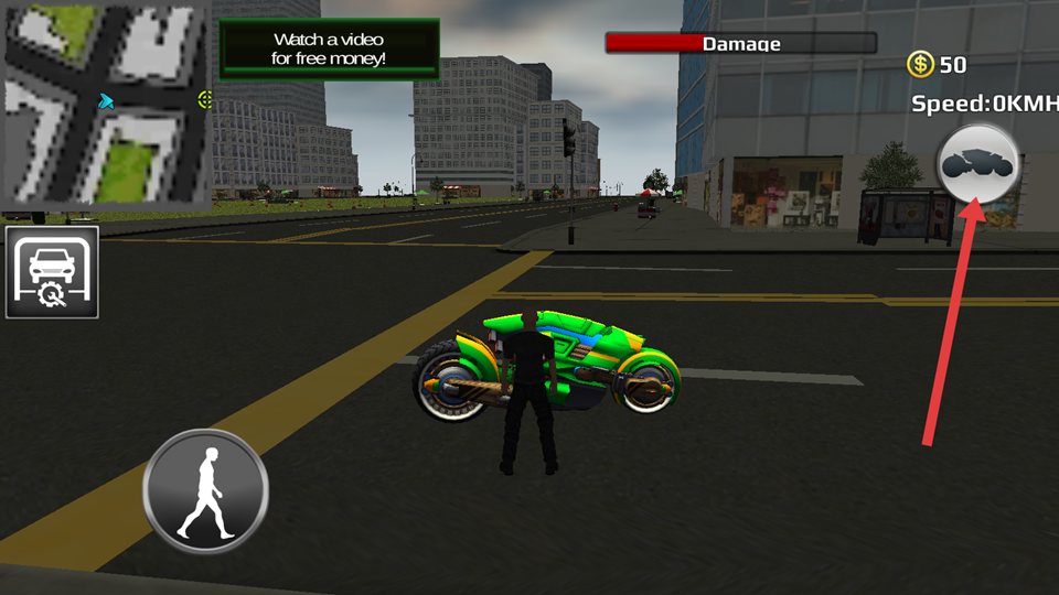 3、靠近摩托车,然后点击右上角的骑行标志,就可以骑上摩托开始驾驶了。