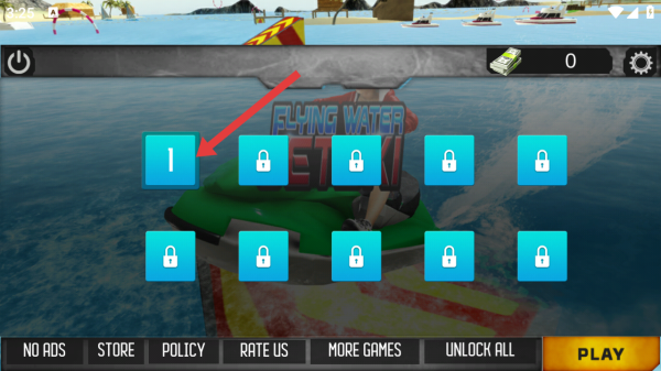 3、在摩托车快艇的关卡选择界面,你需要点击标有数字【1】的按钮,选择第一关开始游戏。