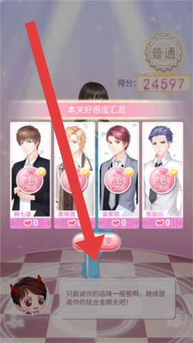 3、在好感度汇总界面(第三张图),紧跟箭头指引点击“结束”按钮,完成当前关卡,查看角色好感度进展。