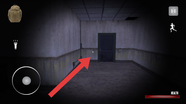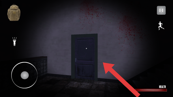 2、画面呈现出一个昏暗的房间场景,中央有一扇深色的门,墙壁上有斑驳的血迹,营造出阴森的氛围,这些元素表明玩家可使用背包、手电筒等功能。