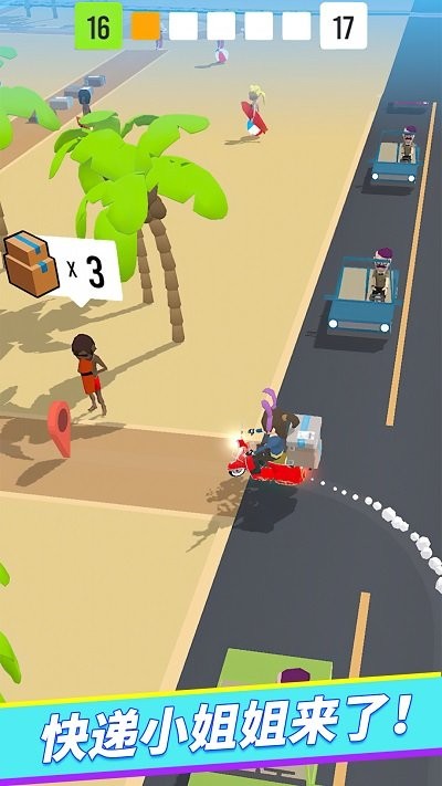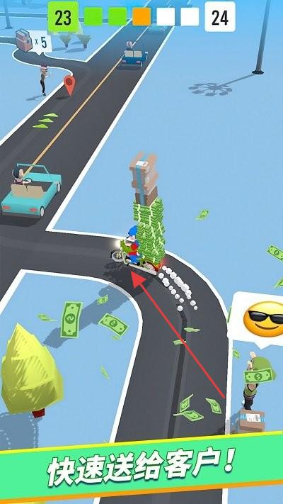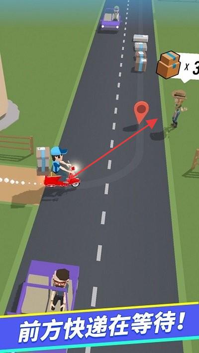 1、玩家操控骑摩托车的快递员角色,在道路上行驶,运输货物。