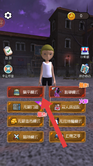 1、画面中央是一个卡通风格的角色,下方有多种游戏模式选项,根据提示选择【躺平模式】,整体呈现出休闲策略类的界面风格,可通过选择不同模式进行体验。