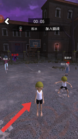 2、场景中有多个卡通角色,背景是带有建筑物和篮球架的户外场景,整体展现出多人在线互动的休闲氛围,是竞技或生存类玩法的游戏界面。