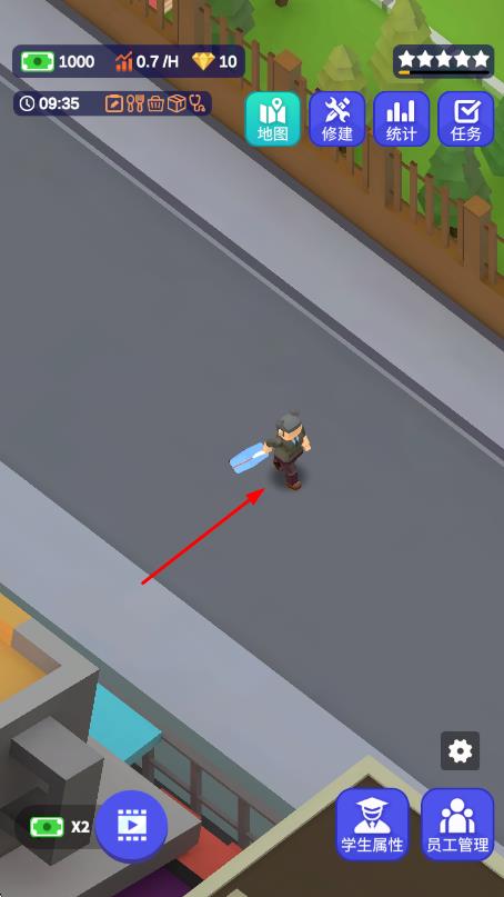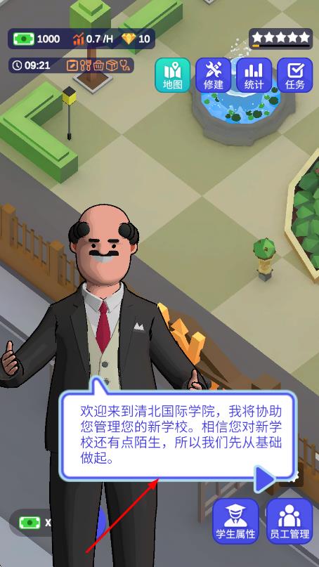 2、进入后跟随引导提示,点击空置地块建造首栋教学楼,招聘首位教师并安排基础课程,完成首批学生招生。