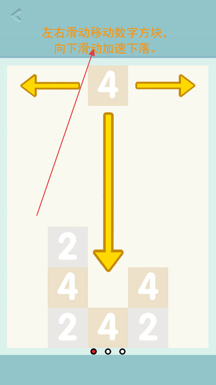 1、进入游戏,通过左右滑动屏幕移动数字方块,合理规划其位置,若想加速方块下落,可向下滑动屏幕。