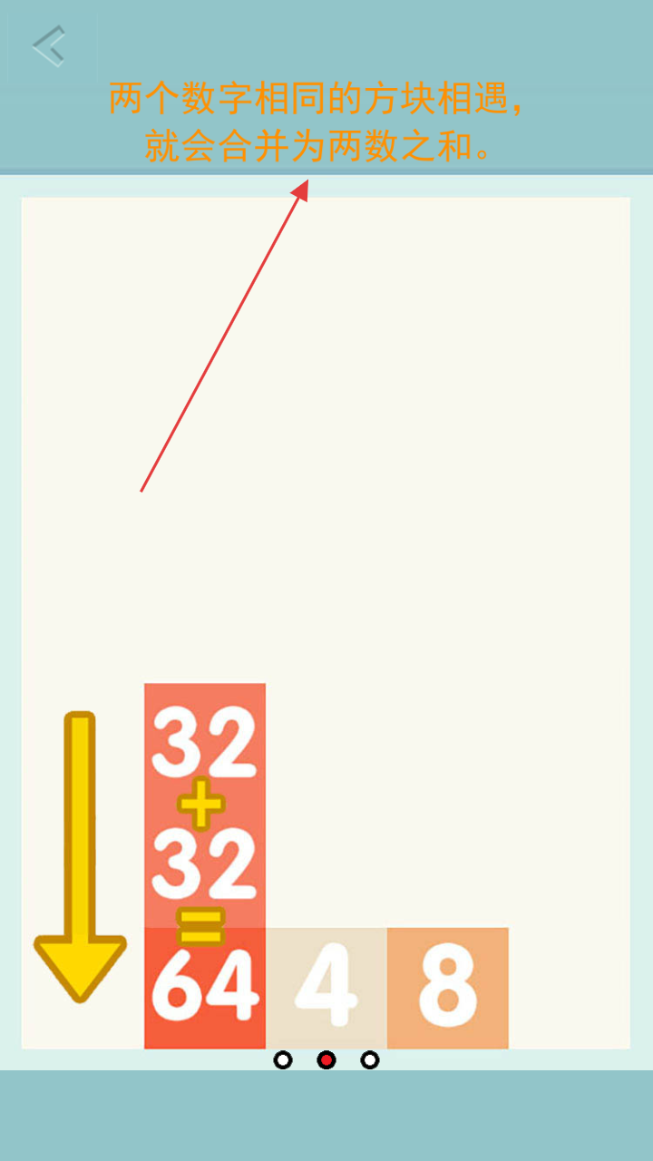 2、当两个相同数字的方块相遇,它们会合并成两数之和的新方块,例如32和32合并成64,持续操作以合成更大数字。