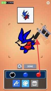 1、进入游戏创作界面,参照上方图案(如蓝色刺猬形象),使用下方工具和颜色按钮(黑、蓝、红等)进行绘制或雕刻,完成后点击【DONE】确认。