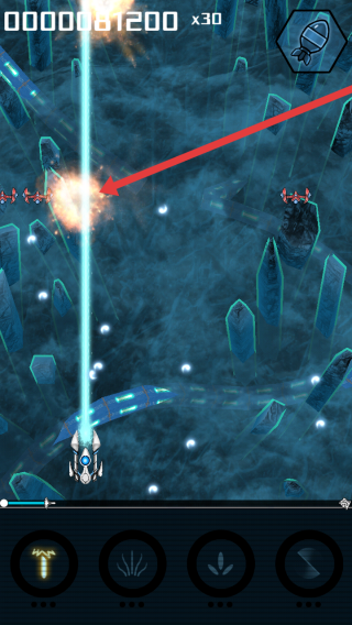 3、游戏中操控飞船发射光线,瞄准敌人进行攻击,如图中所示集中火力消灭前方敌机。