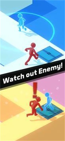 1、点击屏幕开始游戏,利用障碍物遮挡身形,蓝色小人可短暂隐形躲避视线,红色小人能加速冲刺突破封锁区。